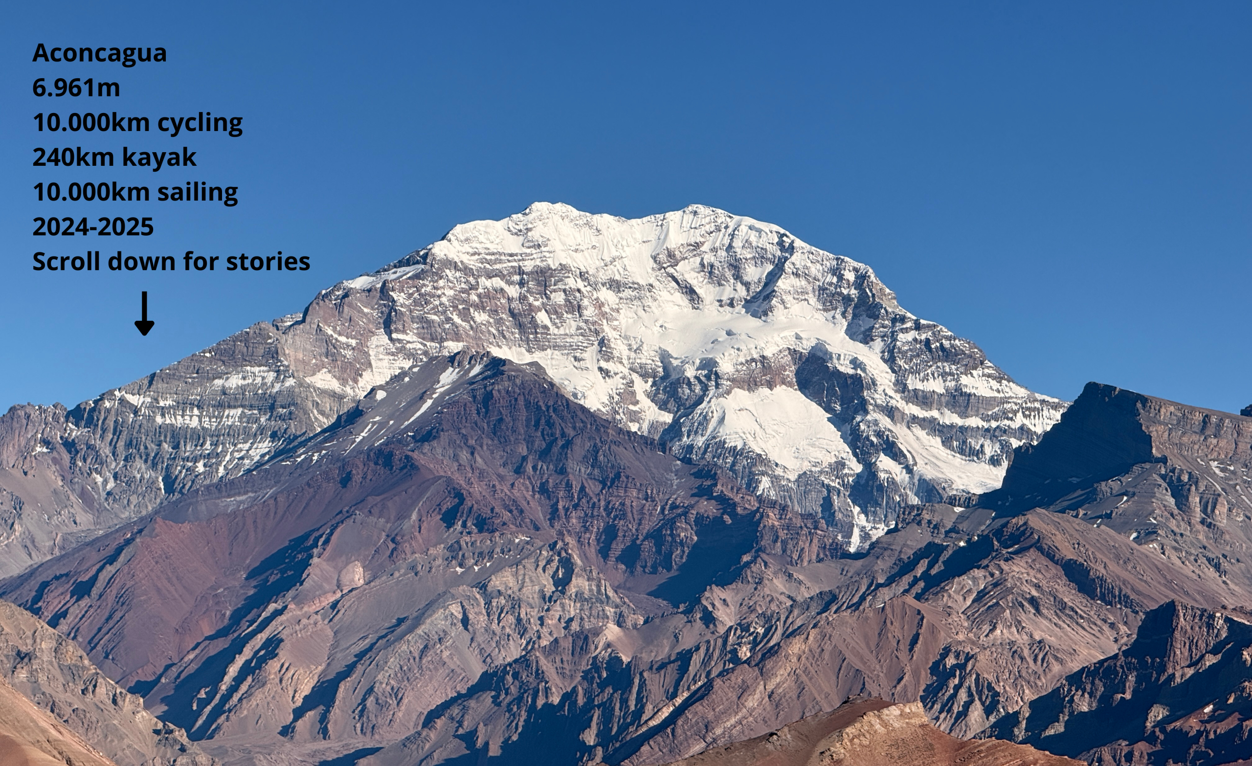 Aconcagua 6.961m 10.000km cycling 240km kayak 10.000km sailing 2024-2025 Scroll down to read stories